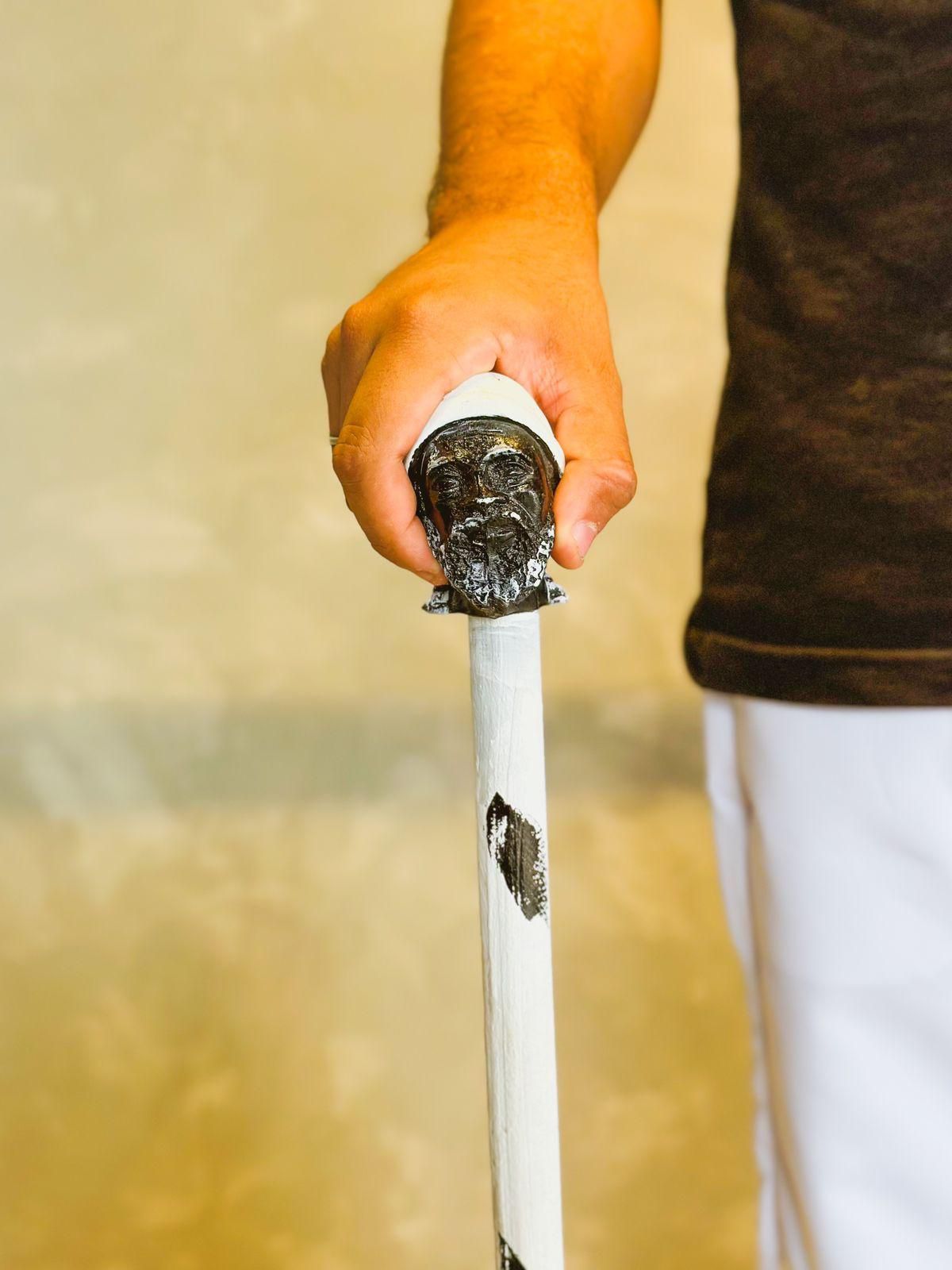 Bengala de madeira com gesso em formato de cabeça para preto velho