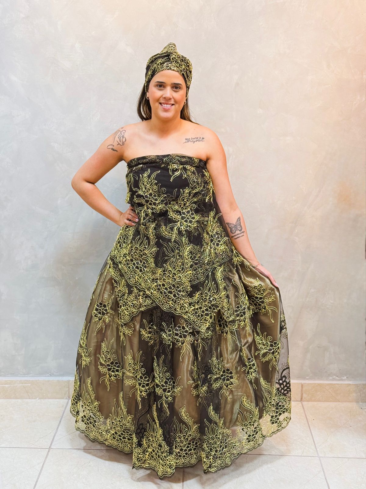 Conjunto de bordado preto com dourado com forro: Pano de cabeça(ojá) reto, pano da costa e saia todos com acabamento em renda, para umbanda e candomblé.