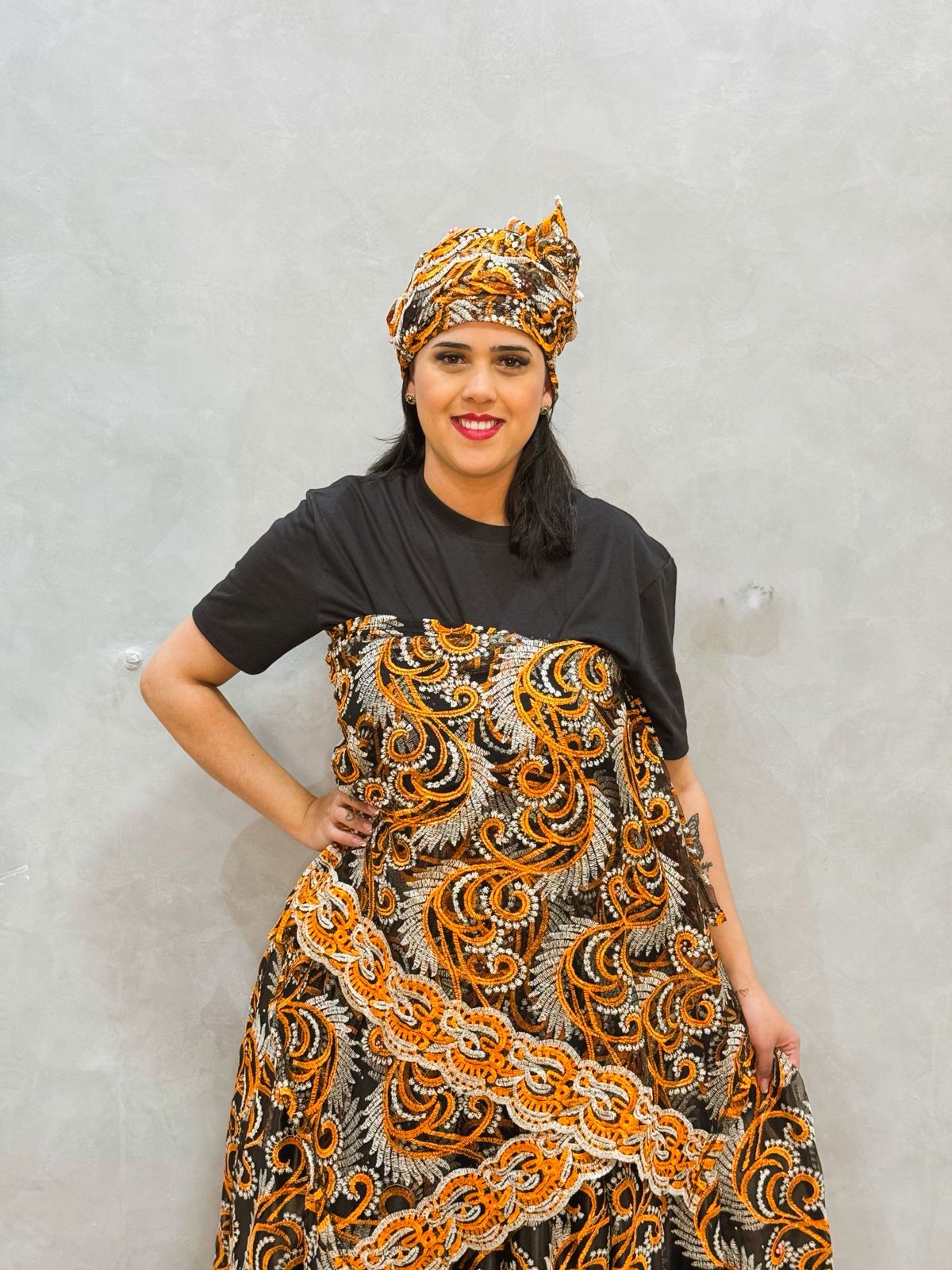 Conjunto de renda luxo preto com bordado laranja e forro preto: Pano de cabeça(ojá) reto, pano da costa e saia todos com acabamento em renda, para umbanda e candomblé.