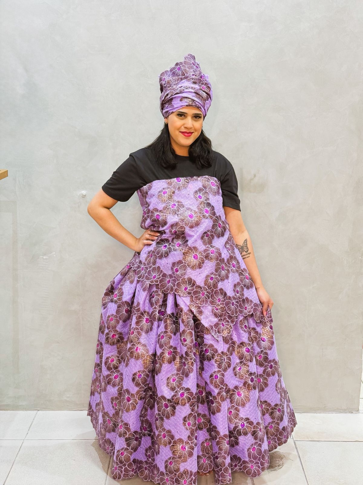 Conjunto de renda luxo todo roxo: Pano de cabeça(ojá) reto, pano da costa e saia todos com acabamento em renda, para umbanda e candomblé.