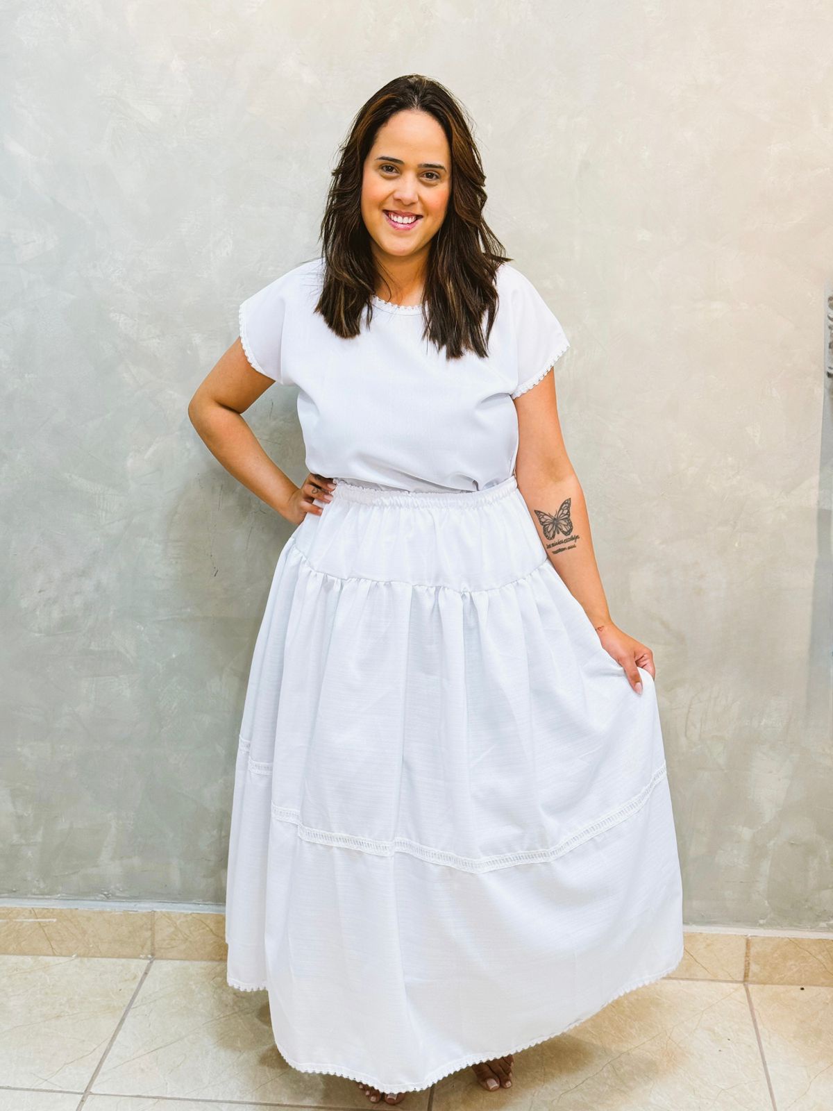 A saia de linhão branca é uma peça clássica e essencial para você ir pro axé!